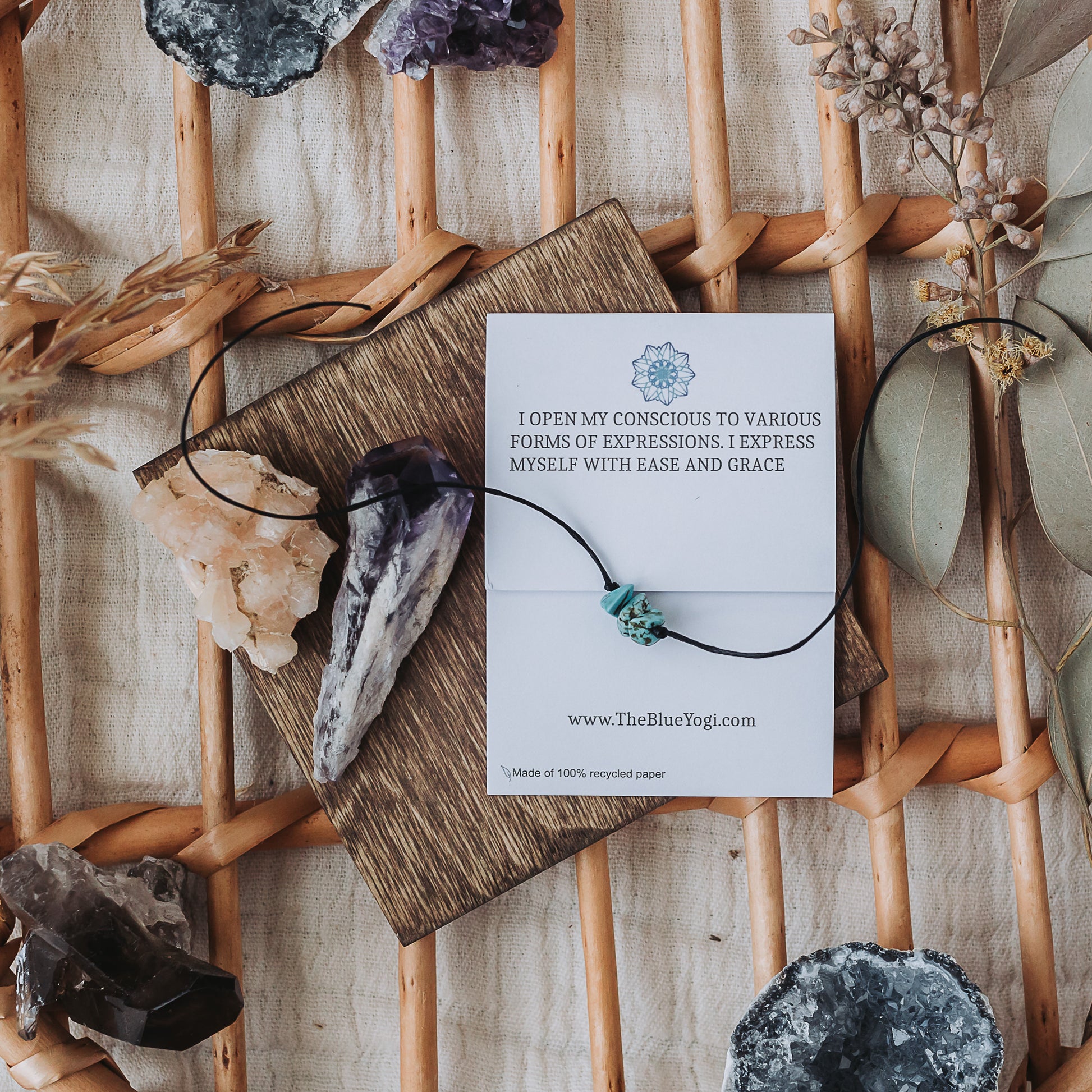 Turquoise Gemstone Healing band. Each Bracelet is 12” long and has tie closure. Can be worn 24-7. It is safe to wear while showering and sleeping. Turquoise balances and aligns all the chakras, stabilizing mood swings and instilling inner calm. It is excellent for depression and exhaustion; it also has been recognized for managing panic attacks. Turquoise promotes self-realization and assists creative problem solving.