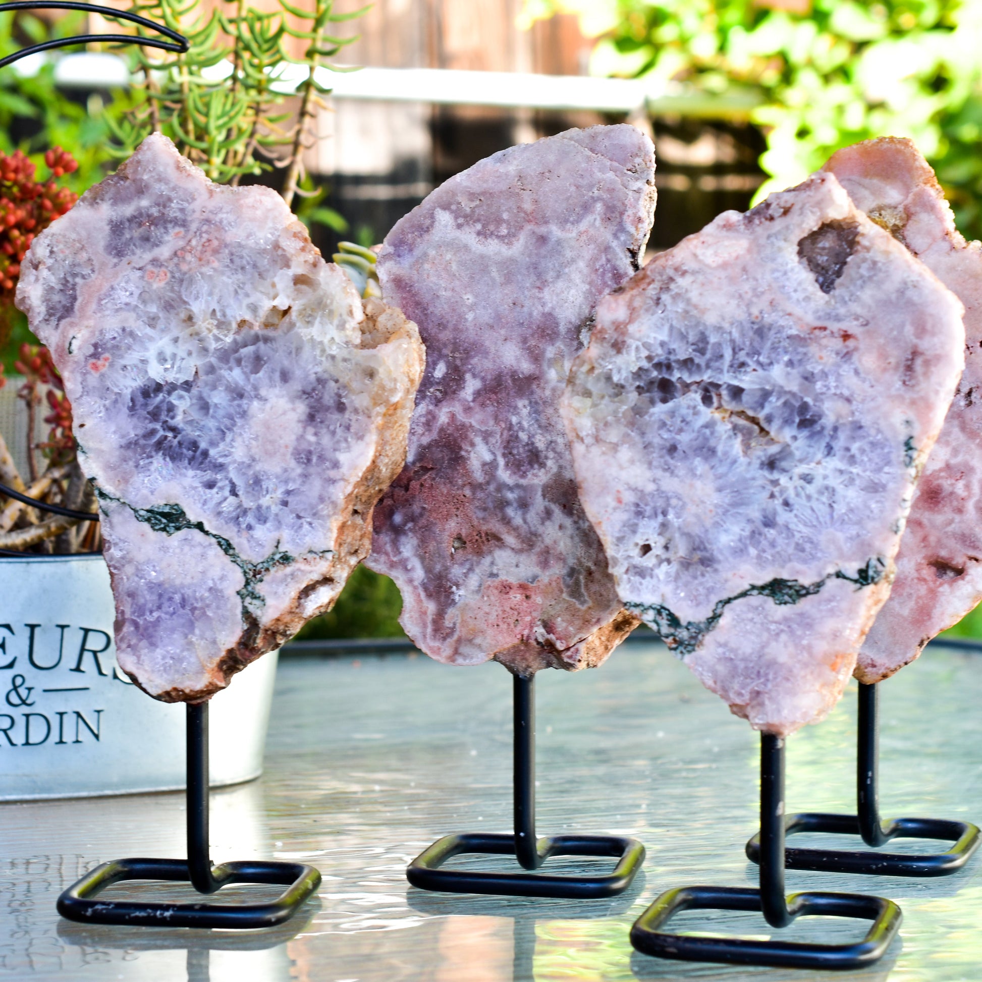 Brazilian Pink Amethyst polished on one side, and displayed on a sturdy metal stand. Available in multiple sizes and different stand colors.