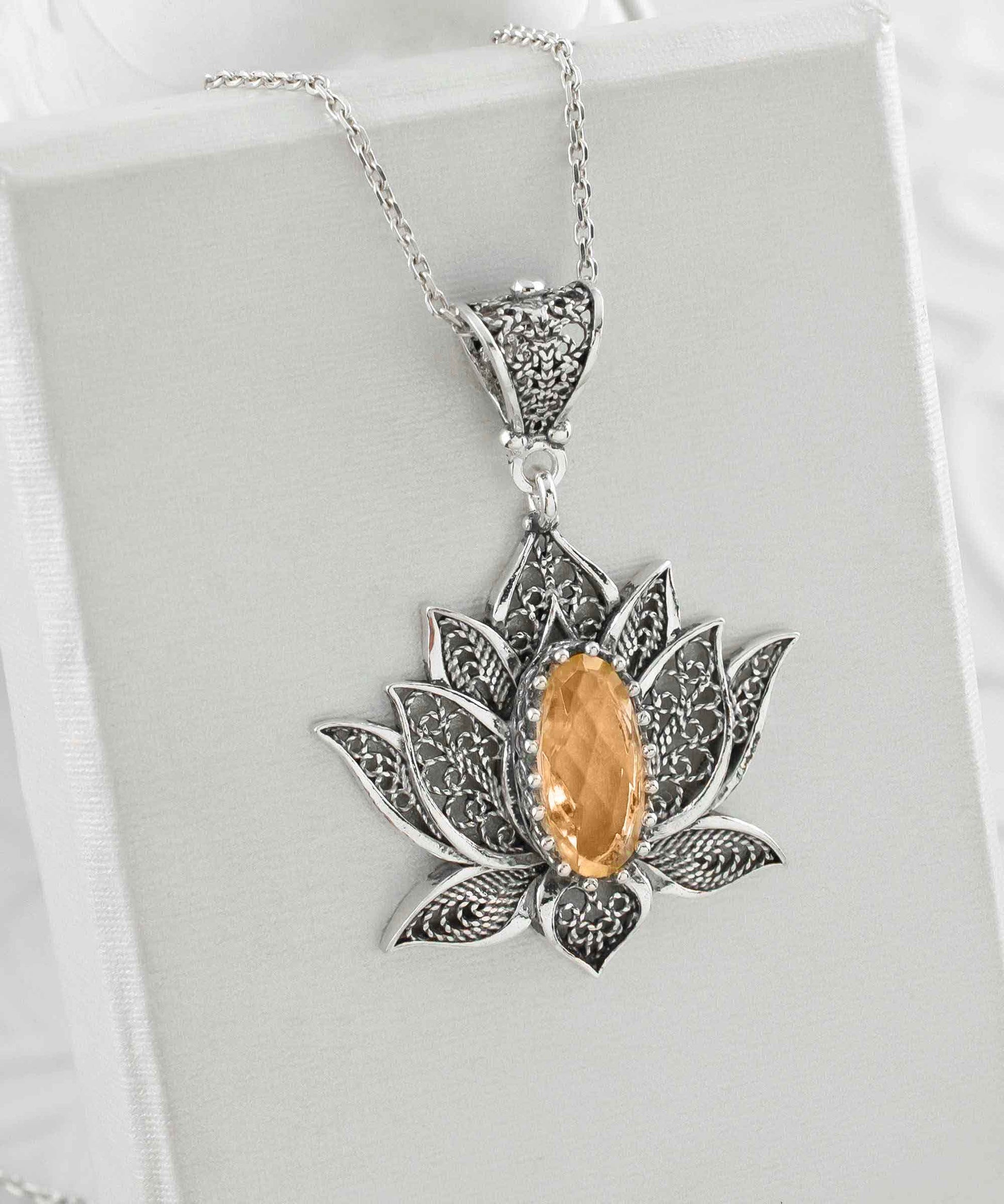 This 925 Sterling Silver handcrafted filigree artisan Citrine gemstone lotus flower pendant necklace comes with 20" silver chain option. Beautifully crafted filigree details will catch all eyes on you. The pendant height is 1.70" and the width is 1.20. The optional sterling silver chain is 18.00"+2.00"with extension and spring close closure.