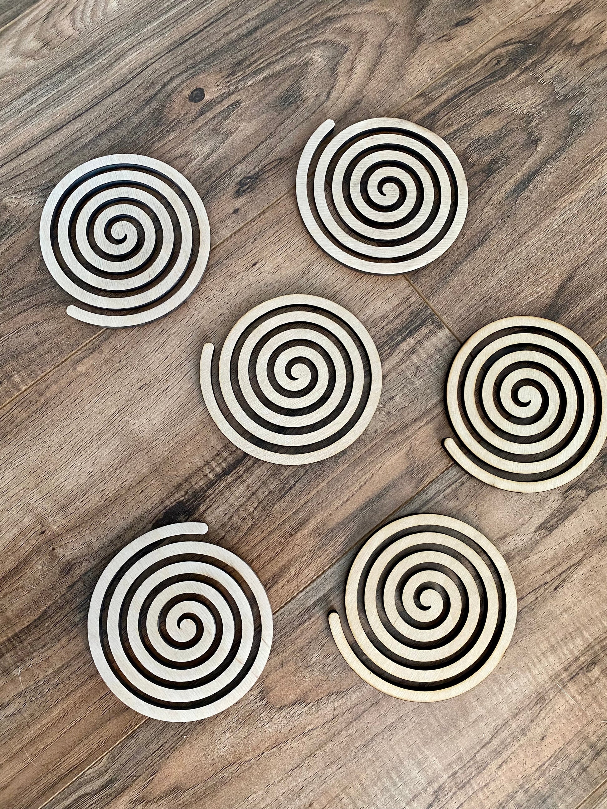 Wood spiral coasters, unique, eye-catching, and functional. Lightweight and durable due to their design and the nature of the wood's construction. The spiral pattern offers enough surface area to catch moisture while still allowing you to see the surface beneath each coaster.